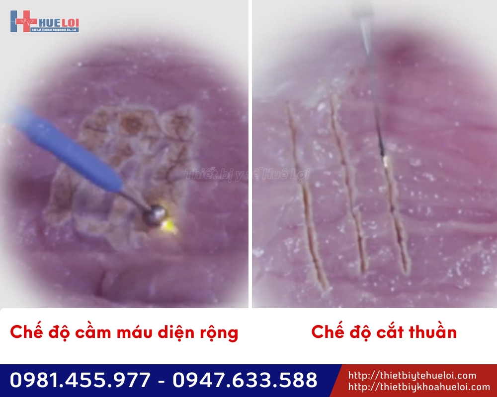 Pure Cut (0-100W): Chế độ cắt đơn thuần dưới công suất đầu vào cao và dòng điện liên tục, nhiệt độ cao tập trung ngay lập tức tại đầu điện cực, gây ra hiện tượng bốc hơi mô, tạo ra vết rạch da sắc, sạch, ít gây tổn thương nhiệt lan tỏa 2 bên.