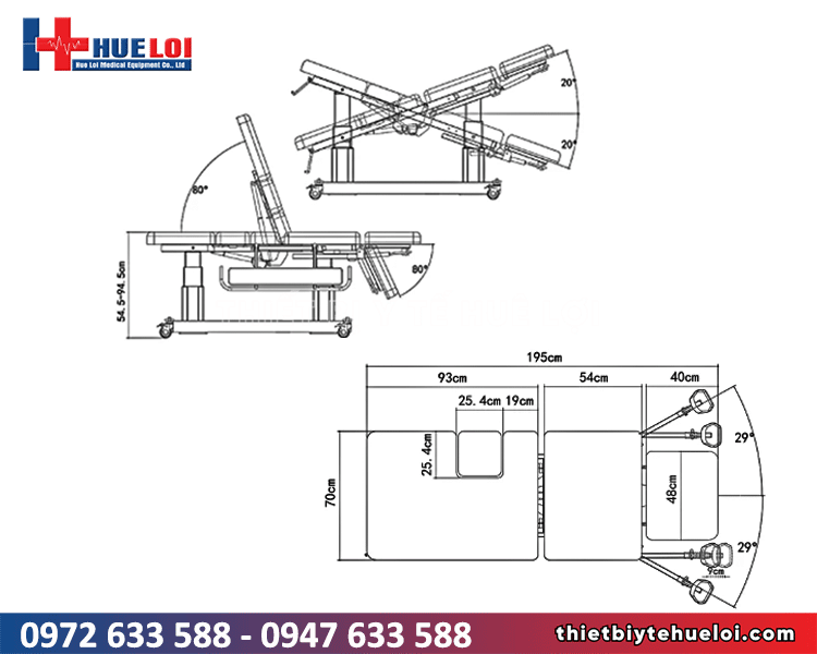- Mặt bàn gồm 3 phần độc lập, cho phép điều chỉnh độ cao tổng thể, tựa lưng, tư thế đầu thấp – chân cao và đầu cao – chân thấp bằng điện.
